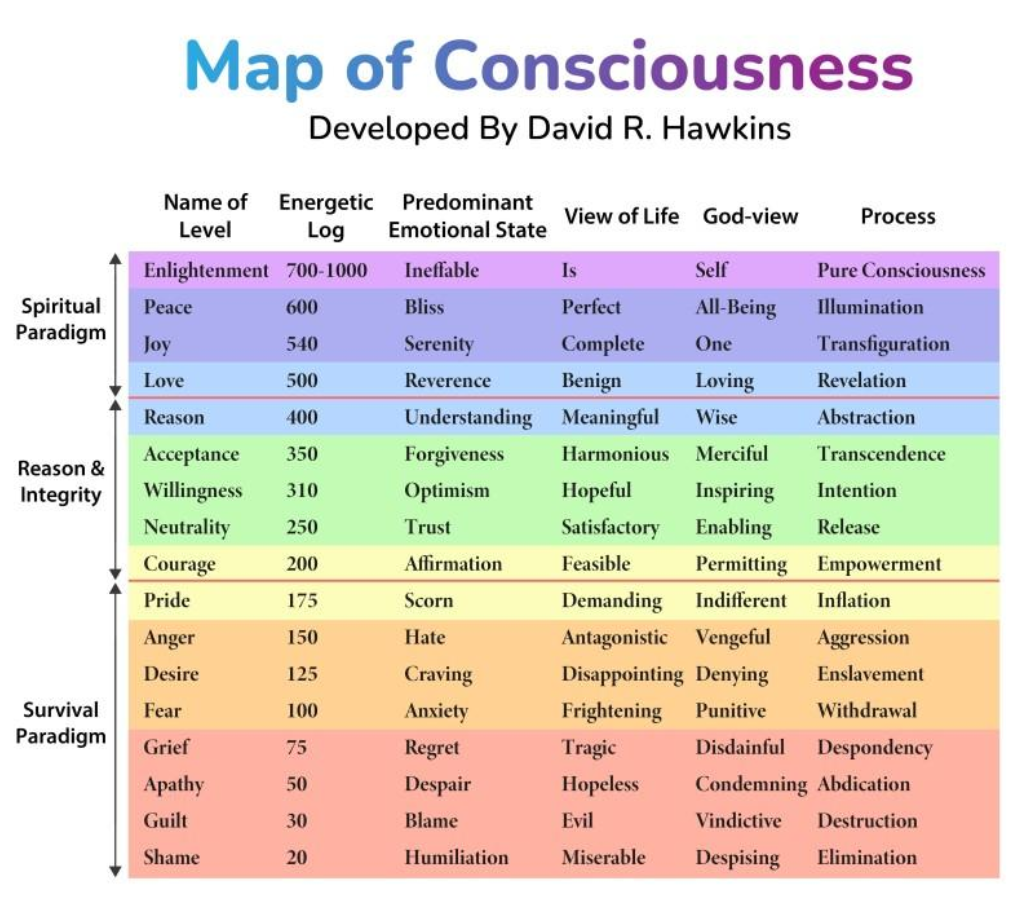 According to David R. Hawkins in Power vs. Force, everything operates at a certain level of energy. He maps these levels from low (fear, guilt, survival) to high (courage, love, purpose).